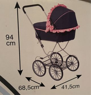 Carrito de muñecas de estilo clásico, perfecto para jugar. - Altura total: 94 cm. - Ancho: 41,5 cm. - Profundidad: 68,5 cm. - Diseño con capota rosa y detalles de lazo.