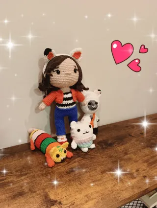 Conjunto de adorables muñecos hechos a mano con la técnica de crochet. - Incluye un muñeco grande con orejas de gato y ropa. - Tres muñecos pequeños de animales. - Colores vibrantes y detalles cuidados. -Se pueden hacer otros x encargo -Si quieres ver más trabajos puedes hacerlo en Instagram sofaycrochet -Hago envíos a través de wallapop o en mano