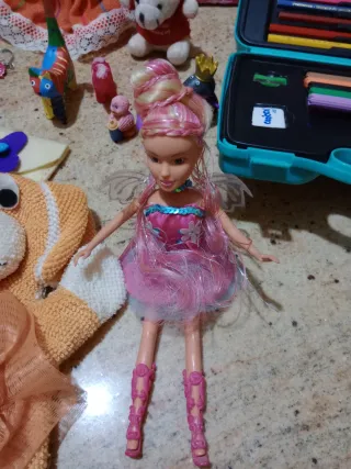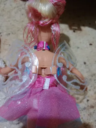 Muñeca hada con un vestido rosa brillante y detalles de lentejuelas. - Cabello rubio y rosa recogido en un peinado. - Alas transparentes. - Botas altas rosas.