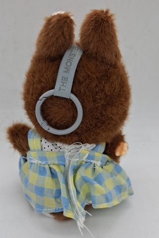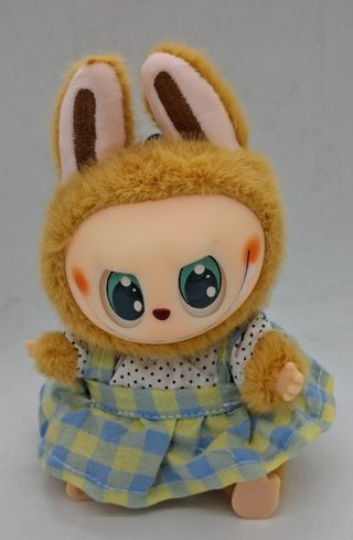 Adorable muñeca de peluche con forma de Labu. - Peluche suave de color marrón. - Detalle de orejas de conejo. - Vestido a cuadros azul y amarillo con lunares negros.