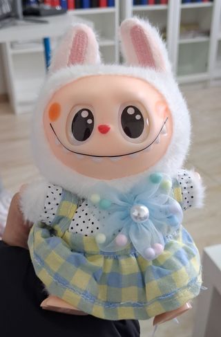 Adorable muñeco estilo Labubu, perfecto para coleccionar o llevar contigo. - Diseño tierno con orejas de conejo. - Detalles bordados y peluche suave. - Incluye un práctico llavero. - Vestido a cuadros con detalles de lunares.