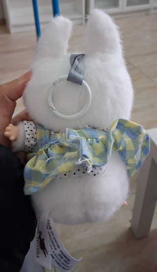 Adorable muñeco de peluche con diseño de conejo y vestido a cuadros. - Detalle de lazo azul con perla y pompones de colores. - Orejas de conejo con interior rosa. - Ropa con estampado de lunares y cuadros amarillos y azules.