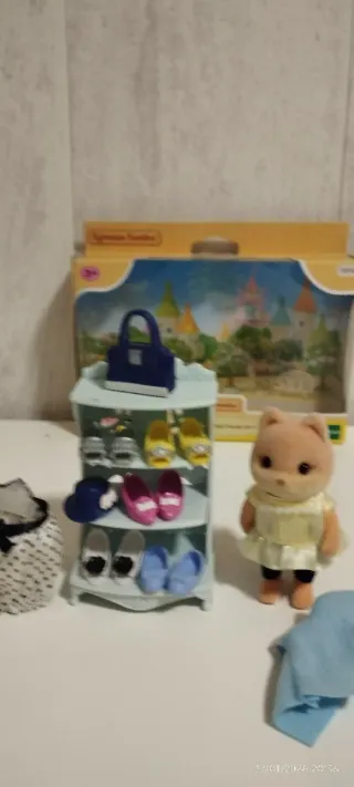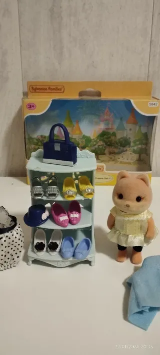 Set de accesorios para casas de muñecas Sylvanian Families. Incluye un zapatero con varios pares de zapatos, un bolso y un sombrero. - Zapatero de color azul claro. - Bolso azul marino. - Sombrero azul con flor blanca. - Zapatos plateados, amarillos, rosas, blancos y azules.