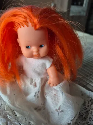 Muñeca Barriguitas clásica de los años 80 con su vestido blanco y encaje. - Pelo largo de color naranja. - Ojos azules. - Vestido blanco con detalles de encaje en el bajo.