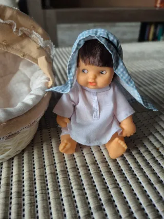 Muñeca de la marca Barriguitas. - Incluye capota y vestido. - Cesta de mimbre.