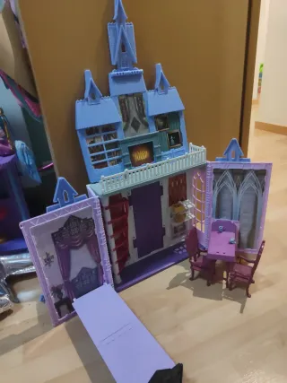 Este castillo de Frozen es un juguete encantador para recrear escenas de la película. - Castillo de juguete inspirado en Frozen. - Diseño detallado con torres y puertas. - Incluye mobiliario como mesa y sillas.