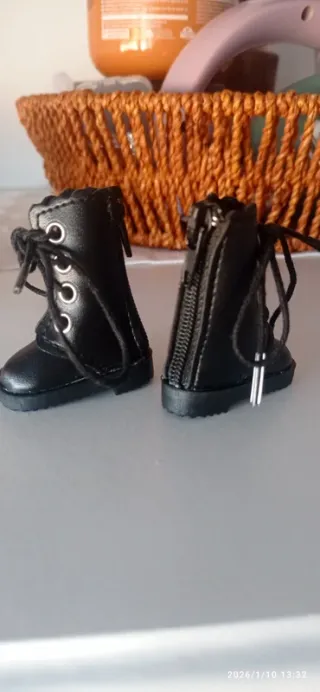 Botines negros para muñeca Ruby Red tipo Siblies, Pullip o similar. Buenos acabados, tienen cremallera por detrás para facilitar la puesta, y cordones delante. El material es goma en la suela y el resto polipiel. 4,8 cm largo suela. 2-2,4 cm ancho suela.