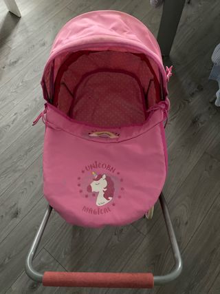 Carrito de muñecas de color rosa con un divertido diseño de unicornio. - Capota ajustable. - Cubierta frontal con estampado de unicornio. - Interior con estampado de lunares. Desmontable y plegable