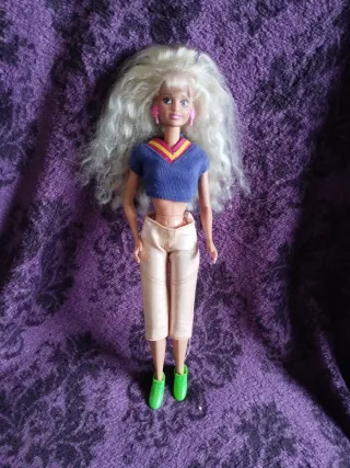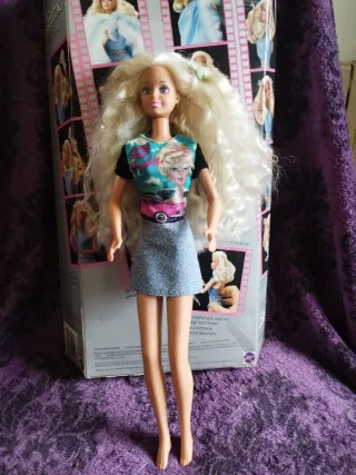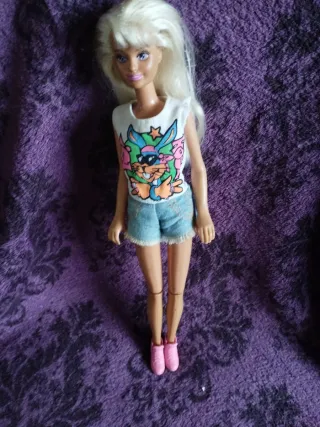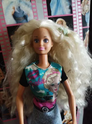 Muñeca de Hasbro con pelo rubio largo y ondulado. Viste una camiseta estampada con imágenes de Barbie y un coche rosa, y una falda vaquera corta.1996 - Muñeca de plástico. - Incluye caja original.