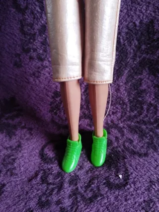 Muñeca con pelo rubio largo y ondulado, vestida con un conjunto deportivo.zapatis y pendientes originales. La ropa es de Barbie - Camiseta corta azul con detalles en amarillo y rojo. - Pantalones cortos color beige. - Pendientes rosas. - Zapatos verdes.