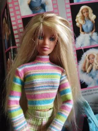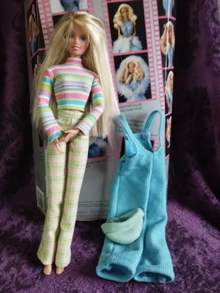 Muñeca Barbie Skipper con su conjunto de ropa original.1998 - Incluye un conjunto de dos piezas: jersey de cuello alto a rayas y pantalón de cuadros. - También se incluye un mono azul con un bolsillo. - La muñeca tiene el pelo rubio largo y ojos azules.