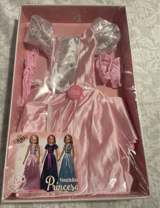 Vestido de princesa para muñecas de 1 metro. Este conjunto incluye un vestido rosa satinado con detalles plateados y un lazo blanco. - Vestido rosa satinado. - Detalles plateados en el corpiño y mangas. - Incluye accesorios a juego. - Nuevo sin abrir en su caja original