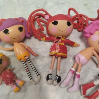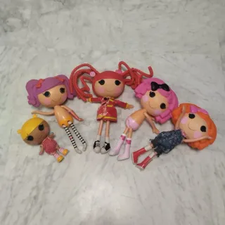 Conjunto de cinco muñecas Lalaloopsy. - Muñeca con pelo morado y vestido rosa. - Muñeca con pelo rojo y vestido amarillo. - Muñeca con pelo rosa y vestido azul. - Muñeca con pelo naranja y vestido azul. - Muñeca con pelo rosa y vestido rojo.