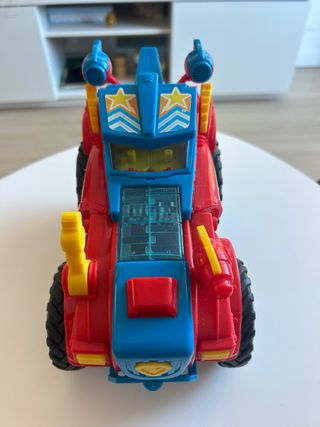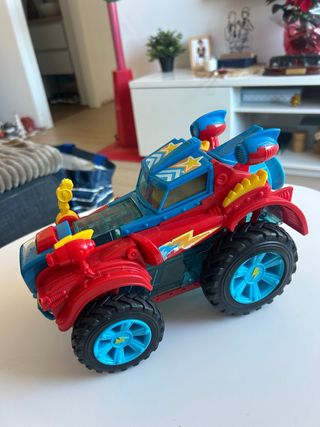 Coche de juguete de la serie SuperZings. Un vehículo llamativo con un diseño robusto. - Colores: rojo, azul y amarillo. - Ruedas grandes todoterreno. - Detalles de estrellas y rayos. Viene10superzings