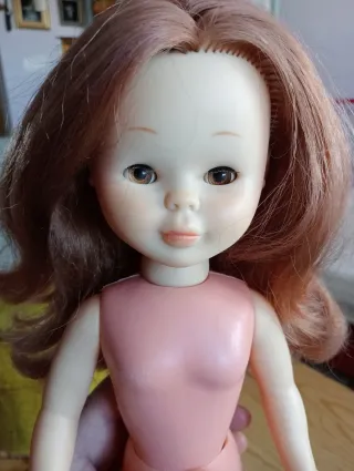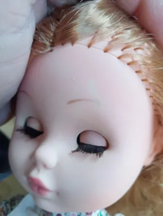 Para arreglar, ver fotos y leer descripción. Tiene varias señales en un muslo y en una zona del culo, ver fotos. Le falta la pieza del cuello del mecanismo interno, parece que tiene un corcho, no sé que es exactamente porque me llegó así y no la he manipulado, ver fotos. Articulaciones flojas. Una rotula de una pierna debe ser reparada, ver fotos, la pierna se puede colocar pero queda suelta. Al envirala, la pierna irá suelta para poder protegerla mejor. Pelo bien pero le faltan tres mechones en zona delantera, ver fotos. Necesita mucha limpieza. Labios faltantes de pintura. Pestañas bien. Cara y brazos han perdido tono. Fotos son d