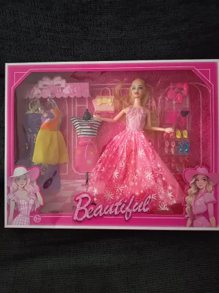 Set de muñeca con varios accesorios para crear looks de moda. - Incluye muñeca con vestido rosa brillante. - Varios vestidos y conjuntos de ropa. - Zapatos y accesorios para el cabello. - Bolso de mano. - Maniquí para exhibir ropa.