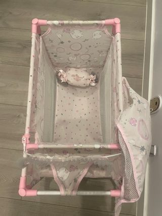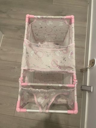 Cuna de juguete con un bonito estampado de nubes y lunas. - Estructura de tubos rosas. - Tejido con estampado infantil. - Dos niveles de cuna. - Cambiador de bebé - Trona - Perchero