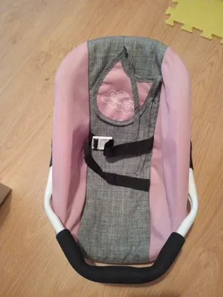 Transportín para muñecas con un diseño moderno y práctico. - Tejido exterior en color gris jaspeado y rosa. - Asas acolchadas en negro. - Incluye cinturón de seguridad.