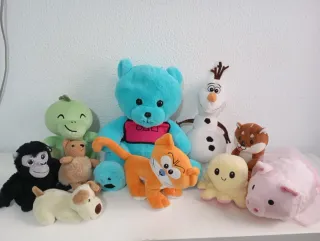 Conjunto de peluches de diferentes animales y personajes. - Peluche de dinosaurio verde. - Peluche de oso azul con babero. - Peluche de gato naranja. - Peluche de muñeco de nieve. - Peluche de zorro. - Peluche de pulpo amarillo. - Peluche de cerdo rosa. - Peluche de perro. - Peluche de mono. - Peluche de oso marrón.