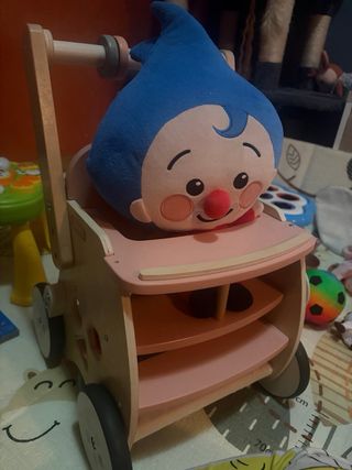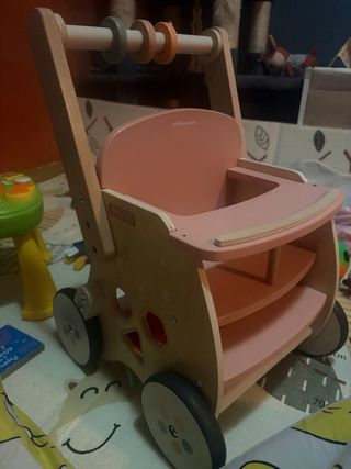 Este andador de madera es perfecto para los más pequeños. Su diseño en tonos pastel lo hace muy atractivo. - Estructura de madera. - Ruedas para facilitar el movimiento. - Incorpora un espacio para llevar muñecos o juguetes. Esta nuevo sin plimplim