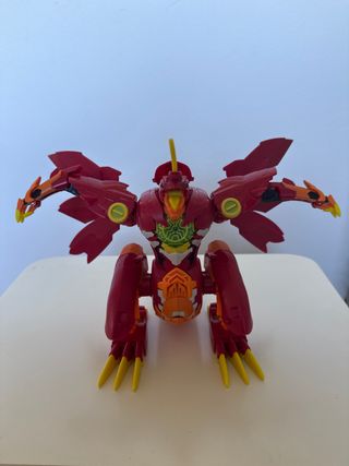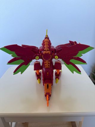 Figura de acción con diseño de dragón. - Color principal rojo con detalles naranjas. - Alas y garras amarillas. - Cabeza de dragón con cresta.