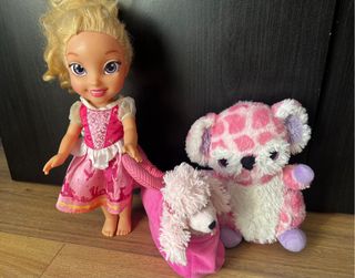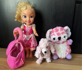Lote de muñeca y peluches. - Muñeca con vestido rosa. - Peluche de perro rosa con cascabel. - Peluche de koala rosa con manchas.