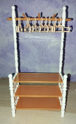 Perchero de juguete para muñecas, ideal para organizar la ropa de tus Barriguitas. Un accesorio divertido para el mundo de las muñecas. - Diseño blanco con detalles. - Dos estantes inferiores. - 10 perchas. - mucheca y vestidos no incluido.