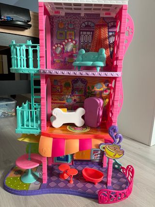 Casa de muñecas Enchantimals con varios niveles y accesorios. - Diseño colorido y detallado. - Incluye muebles y complementos. - Ideal para jugar con figuras Enchantimals. Tiene de desperfecto una pieza trasera de carton, que está algo doblada Incluye las muñecas de la foto