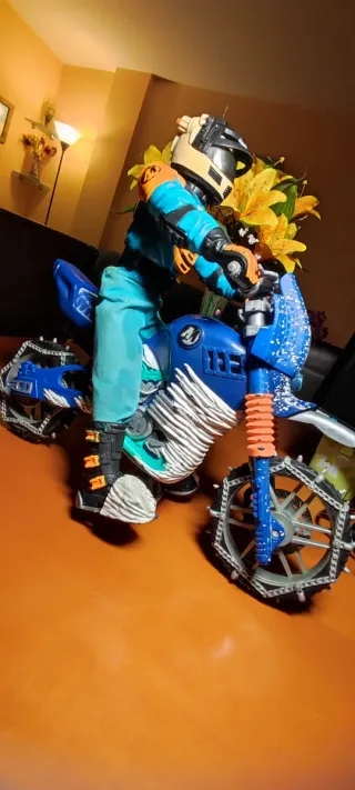 Figura de Action Man con moto de nieve. - Moto de color azul con detalles blancos y naranjas. - Figura con traje de invierno azul y casco. - Ruedas con cadenas para la nieve. - Muñeco independiente. Encaja manos en manillar y pies en estribera a la perfección. - Casco con pantalla retráctil automática.