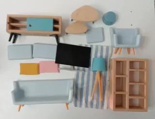 Set de muebles en miniatura para casa de muñecas, ideal para crear un ambiente acogedor. - Sofá azul claro con cojines rosa y naranja. - Estantería de madera. - Mesa de centro de dos niveles. - Televisor con mueble. - Sillón azul claro. - Lámpara de mesa azul. - Taburete azul. - Alfombra de rayas azules y blancas. -Con caja.