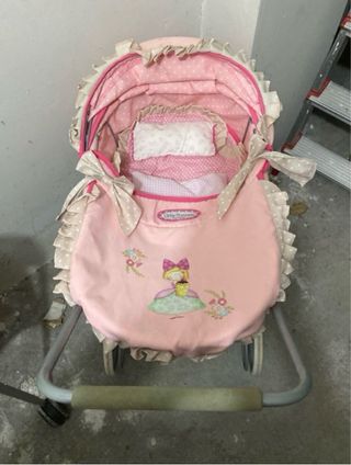 Carro para muñecas de gran tamaño, ideal para juegos infantiles. - Estructura metálica. - Asiento acolchado en color rosa. - Empuñaduras forradas. - Ruedas blancas.