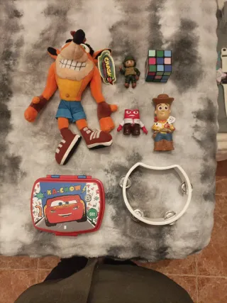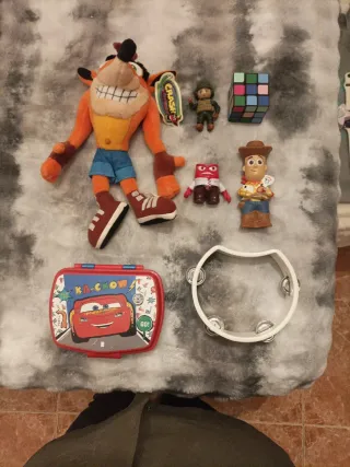 Lote variado de muñecos y juguetes. - Peluche de Crash Bandicoot. - Figura de soldado. - Cubo de Rubik. - Figura de Inside Out (Miedo). - Figura de Woody (Toy Story). - Fiambrera infantil de Cars. - Pandereta blanca.