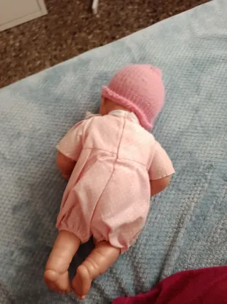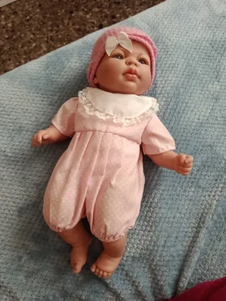 Adorable muñeca bebé vestida con un conjunto rosa y gorrito a juego, aún conserva el olor a vainilla. Y si le apretas en la barriga llora - Vestido rosa con lunares blancos. - babero blanco con encaje. - Gorrito rosa con lazo blanco.