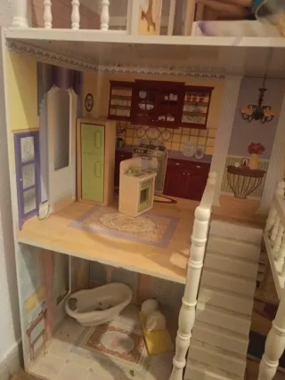 Casa de muñecas de gran tamaño, ideal para coleccionistas o para jugar. Las dimensiones de la casa son 68cm de alto, 72cm ancho, 39cm de profundidad. Tiene algunos desperfectos que salen en las fotos. Los muebles van de regalo, son un balancin, una trona y un pupitre escolar