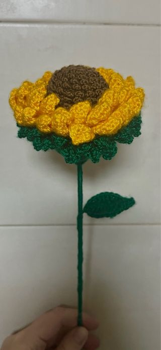 Precioso girasol tejido a mano con la técnica de crochet. Amigurumi La flor al estirarla sale la muñeca - Flores de pétalos amarillos. - Centro marrón. - Tallo y hoja verdes.
