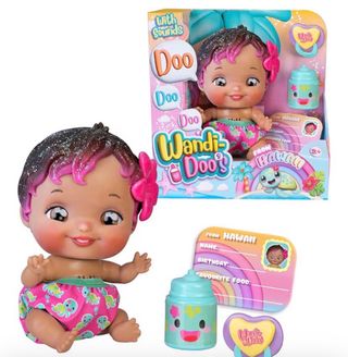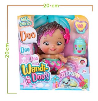 Muñeca Wandi Doo's con temática de Hawaii, que emite sonidos. Incluye accesorios. - Muñeca con purpurina en el pelo. - Incluye un biberón y una tarjeta de identificación. - La muñeca lleva un pañal con estampado de tortugas.