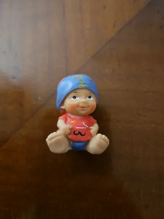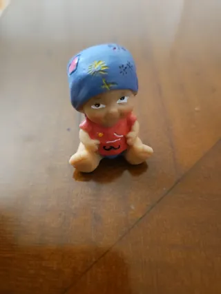 Pequeño muñeco de bebé pelón, ideal para coleccionar o jugar. - Diseño tierno con gorro azul. - Ropa blanca con detalle azul.