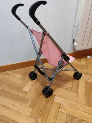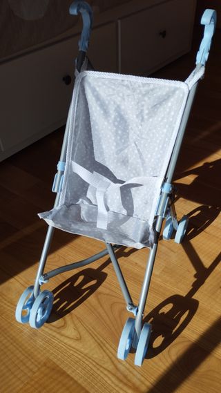 Silla de paseo de juguete para muñecas, con un diseño moderno y divertido. - Estructura metálica. - Ruedas de plástico. - Asiento y respaldo de tela con estampado de estrellas. - Arnés de seguridad. Silla de paseo para tu bebé Mimittos. Para muñecos de 33 a 43 cm. Plegable. Medidas: 51x26,5x55 cm. Piezas pequeñas. Poco usado Medidas abierto : 28x40x53 Medidas plegado : 15x10x60 Peso : 1 kg