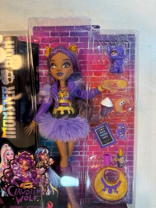 Muñeca Monster High de Clawdeen Wolf, lista para jugar. - Incluye accesorios como un bolso, un libro y una mascota. - La muñeca lleva un atuendo morado con detalles dorados. - Viene en su empaque original.