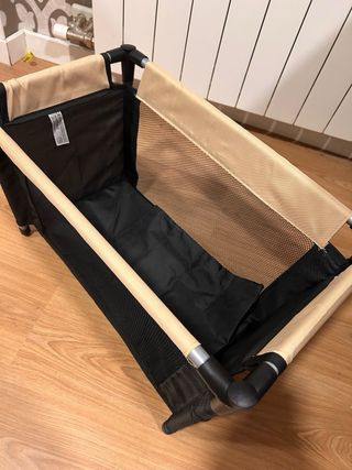 Cuna de viaje para muñecos de la marca Miyo. Incluye bolsa de transporte y colchoneta. - Estructura de metal y tela. - Diseño plegable para fácil almacenamiento. - Color beige y negro.