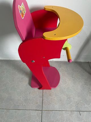 Trona de madera para muñecas, con un diseño colorido y divertido. - Estructura principal en color rosa. - Bandeja de alimentación en color amarillo. - Barra de seguridad frontal en color amarillo. - Detalle de sticker Chou Chou en la parte superior.