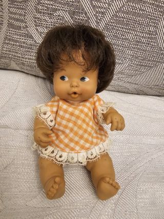 Muñeca clásica Barriguitas, un juguete original. Años 70 originales - Vestido a cuadros naranja y blanco. - Adorno de encaje en mangas y bajo. - Pelo castaño. - Ojos azules.
