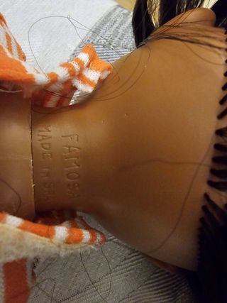 Muñeca Nancy original de piel morena. Un clásico para coleccionistas. - Pelo largo y oscuro. - Ojos azules. - Vestido a rayas naranjas y blancas.