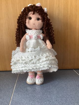 Preciosa muñeca amigurumi vestida de comunión. - Hecha a mano con ganchillo. - Vestido blanco con detalles florales. - Pelo rizado castaño y diadema a juego. - Incluye trajecito de cambio. - Mide 35cm