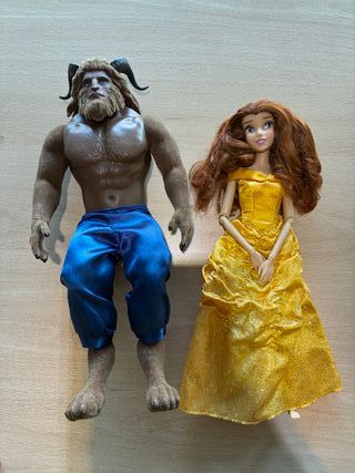 Set de muñecos de los personajes de La Bella y la Bestia de la película. Originales comprados en disneyland paris la semana santa pasada. Originales bella y bestia - Muñeco de la Bestia con traje azul. - Muñeca de Bella con vestido amarillo.
