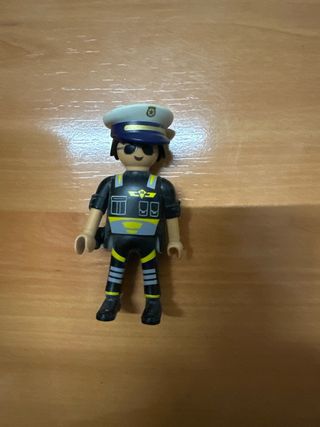 Lote de tres muñecos Playmobil. - Muñeco con gorra de policía y uniforme negro. - Muñeco con gorra de policía y chaleco naranja. - Muñeco con pelo castaño, gafas y chaqueta negra.