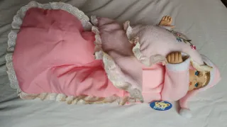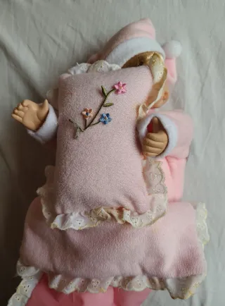 Este muñeco dormilón musical vintage es un tesoro para coleccionistas. Su diseño tierno y los detalles de su ropa lo hacen especial. - Muñeco de cuerda. - Melodía musical. - Detalles bordados de flores. - Adornado con encaje blanco y volantes. Funciona perfectamente. Está sin usar, tiene ligeras marcas del paso del tiempo pero está muy bien.