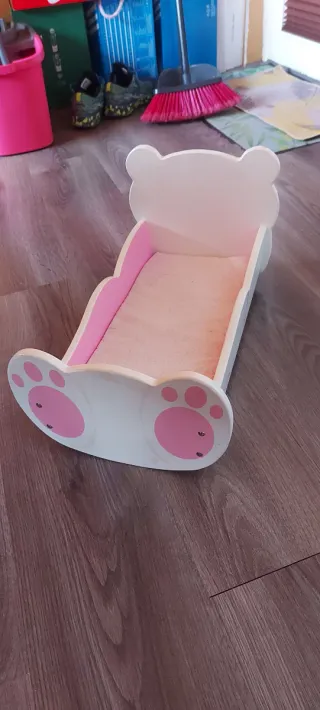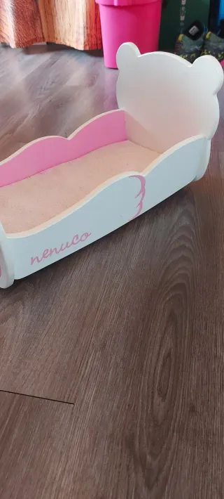 Cuna de madera con diseño de oso, ideal para muñecas. - Estructura de madera blanca. - Detalles en color rosa. - Acolchado interior suave.