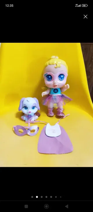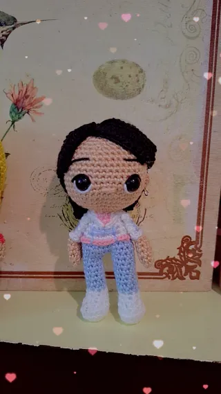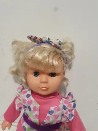 Muñeca con pelo rubio y ojos azules, vestida con ropa colorida. - Incluye diadema con lazo. - Chaleco con estampado de corazones. - Pantalones morados. - Zapatos rosas.
