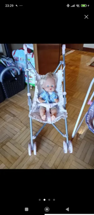 Carrito de muñecas de color rosa, perfecto para jugar. - Estructura de metal. - Capazo acolchado. - Cesta inferior de tela. Solo tiene un poco deteriorado el manillar que es de espuma, y algunos pequeños roces ( salen en foto), lo demás perfecto y limpio. La altura del manillar es regulable en lo más alto mide 71 cm y en la parte más baja 54.